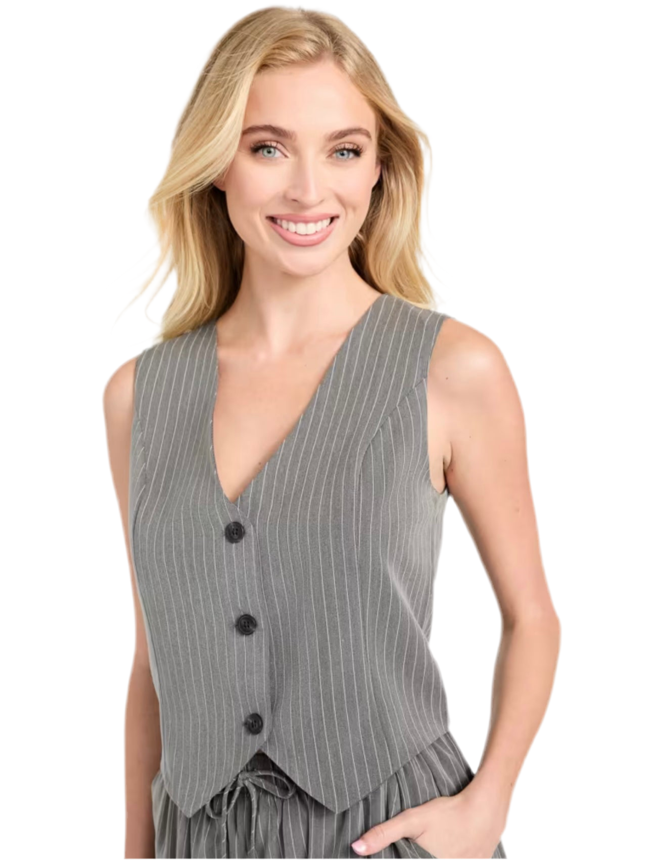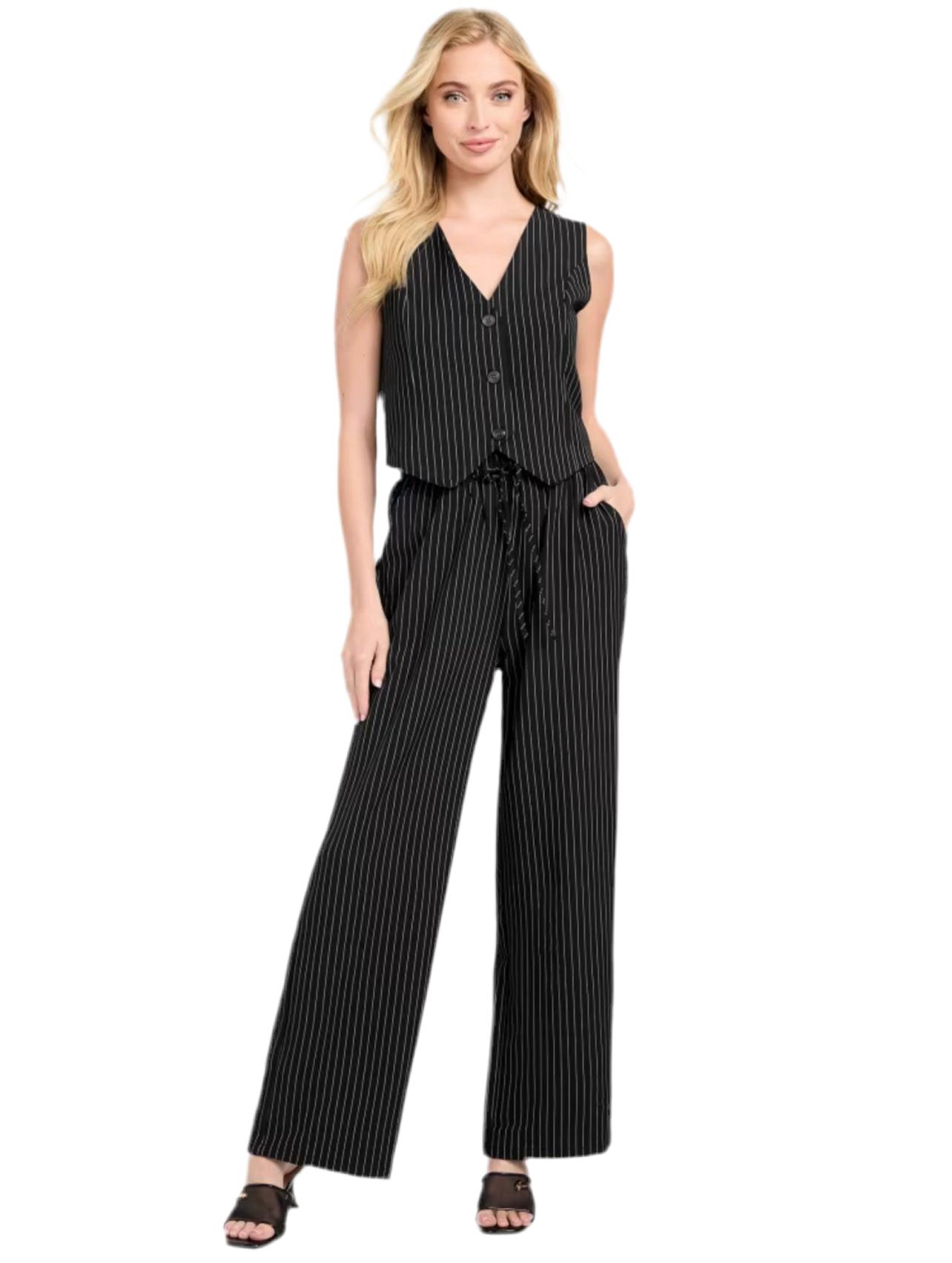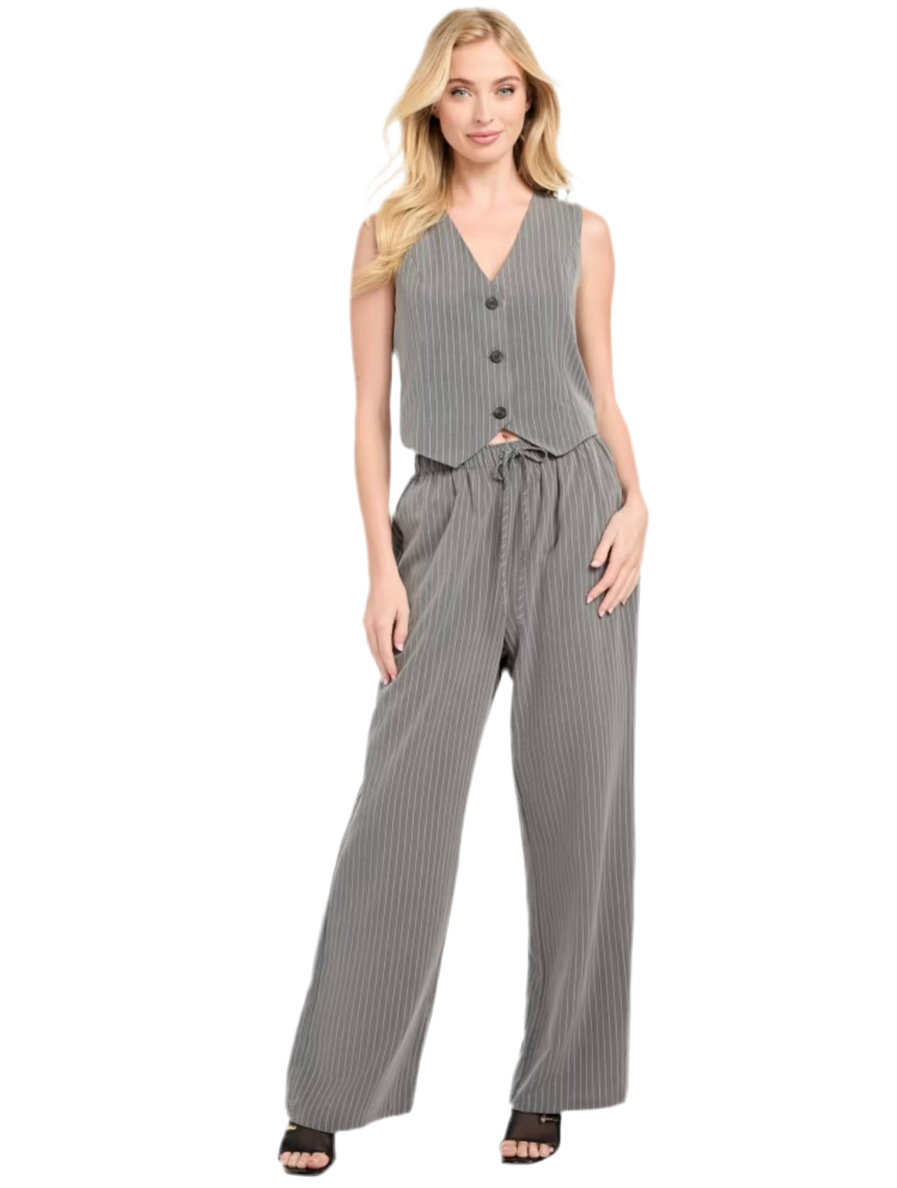 Set de dos piezas con chaleco y pantalón de pierna ancha en tela de rayas finas. Un diseño elegante y versátil que se adapta a looks de oficina o salidas casuales con estilo.