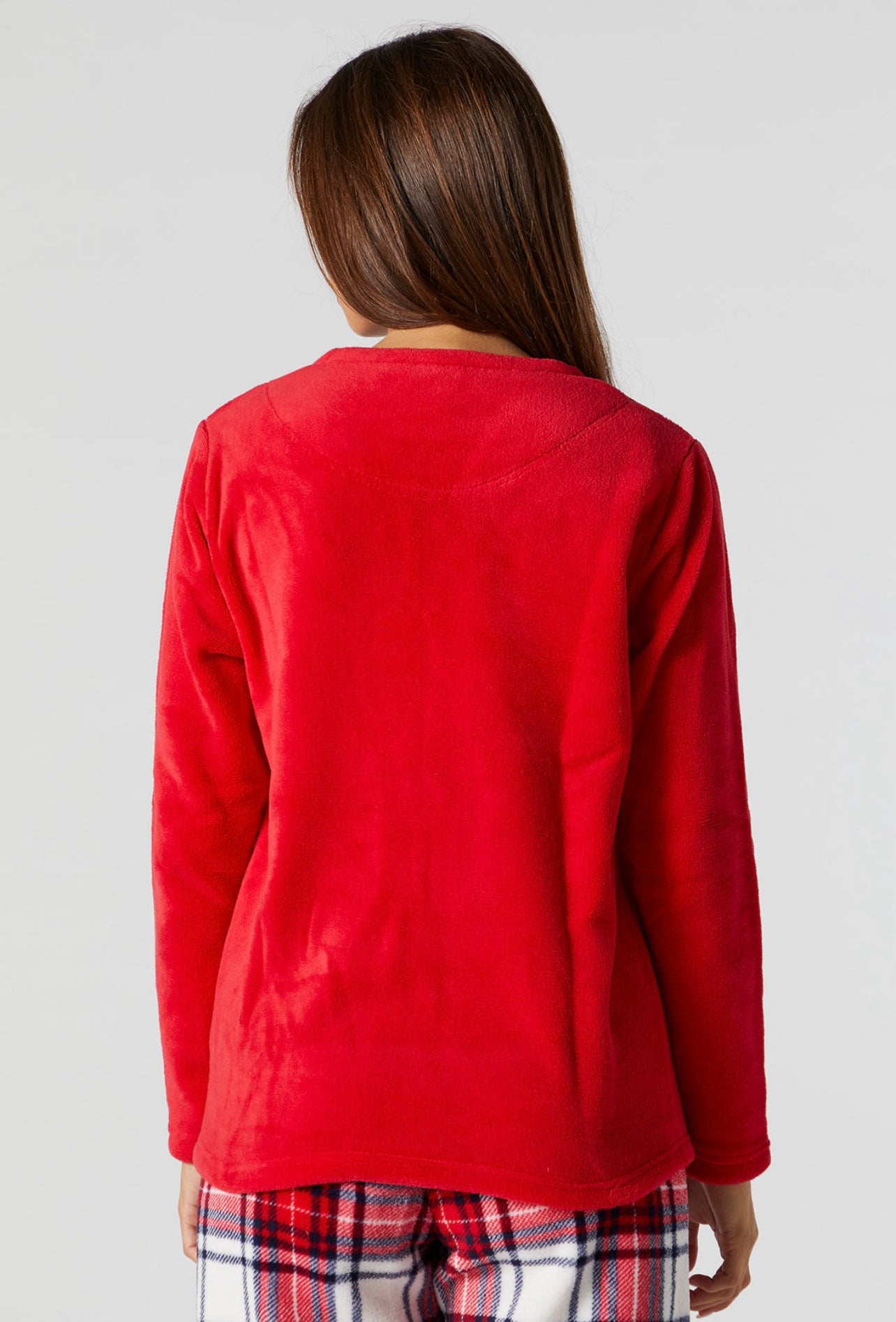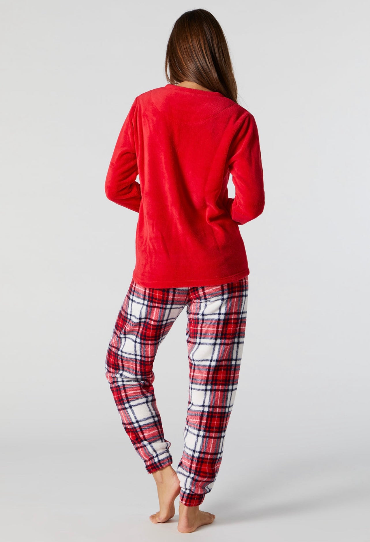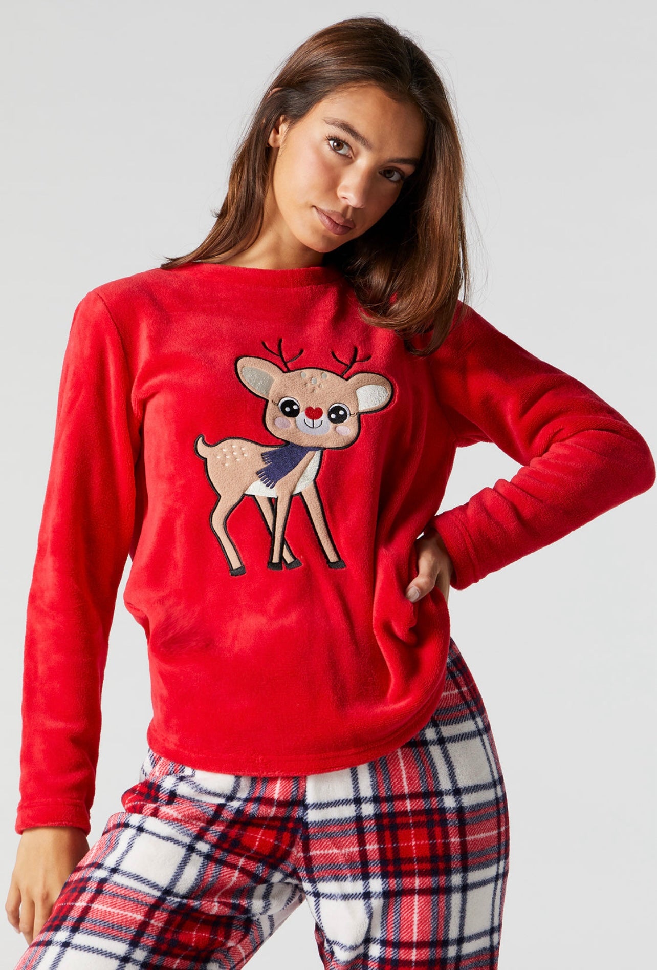 Su diseño combina un adorable estampado de reno con pantalón de cuadros navideños, creando el equilibrio perfecto entre confort y espíritu festivo.