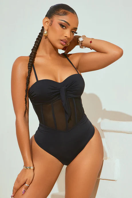 Traje de baño entero con delicados detalles en malla que aportan un aire moderno y distinguido. Su escote tipo corazón con lazo central equilibra feminidad y estilo, mientras que el diseño estructurado realza la silueta con elegancia. Una prenda versátil y sofisticada para disfrutar en la playa, la piscina o cualquier momento especial bajo el sol.