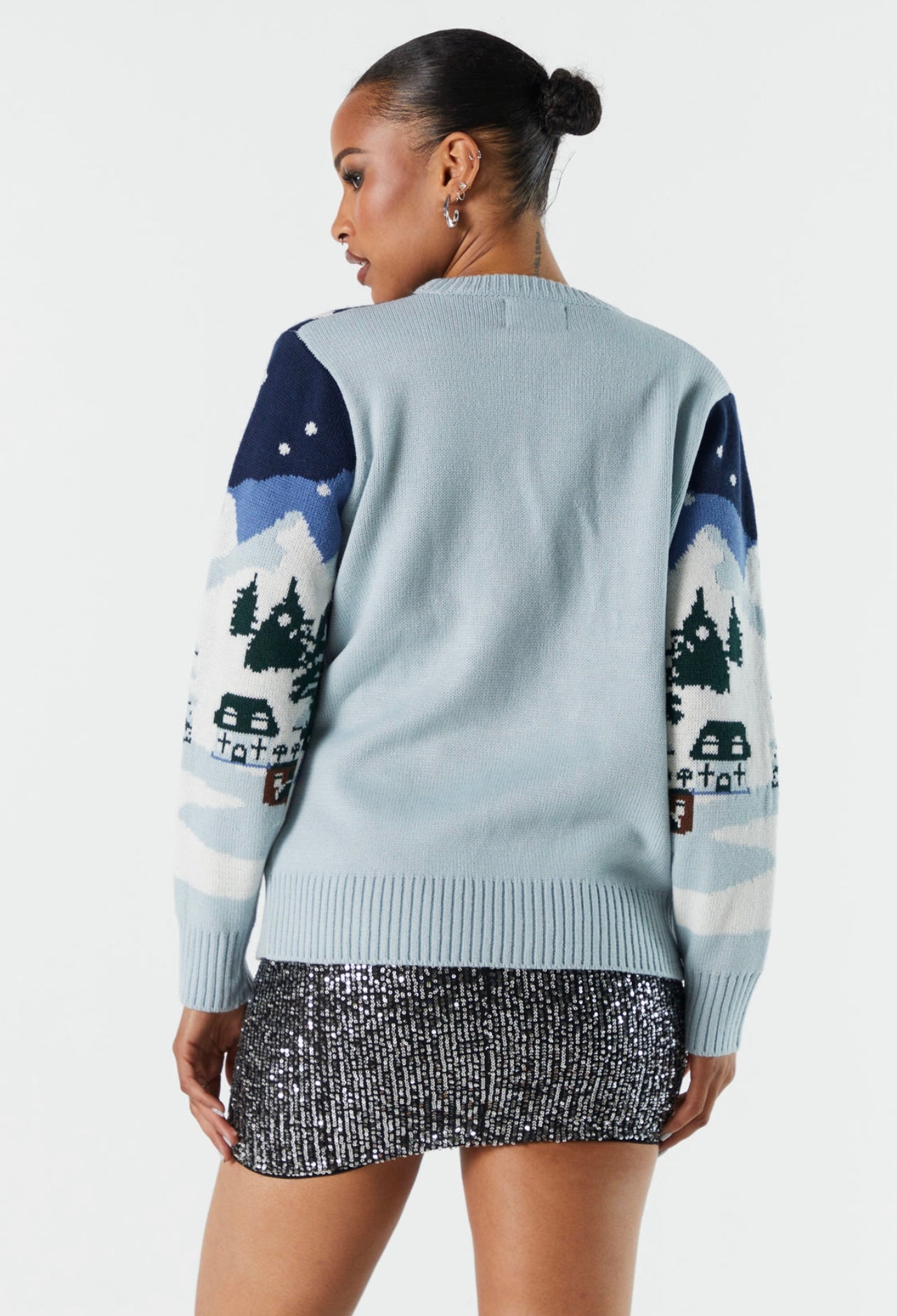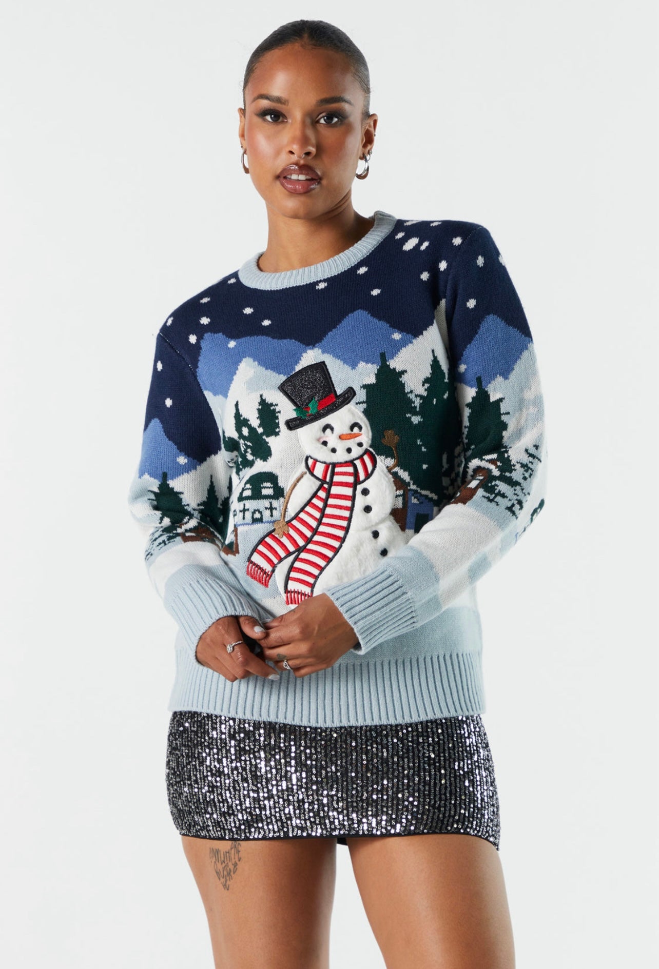 Tejido con delicadeza en tonos fríos, este suéter destaca por su diseño invernal con detalles de muñeco de nieve. Una prenda acogedora y sofisticada que combina calidez y estilo en la temporada festiva.